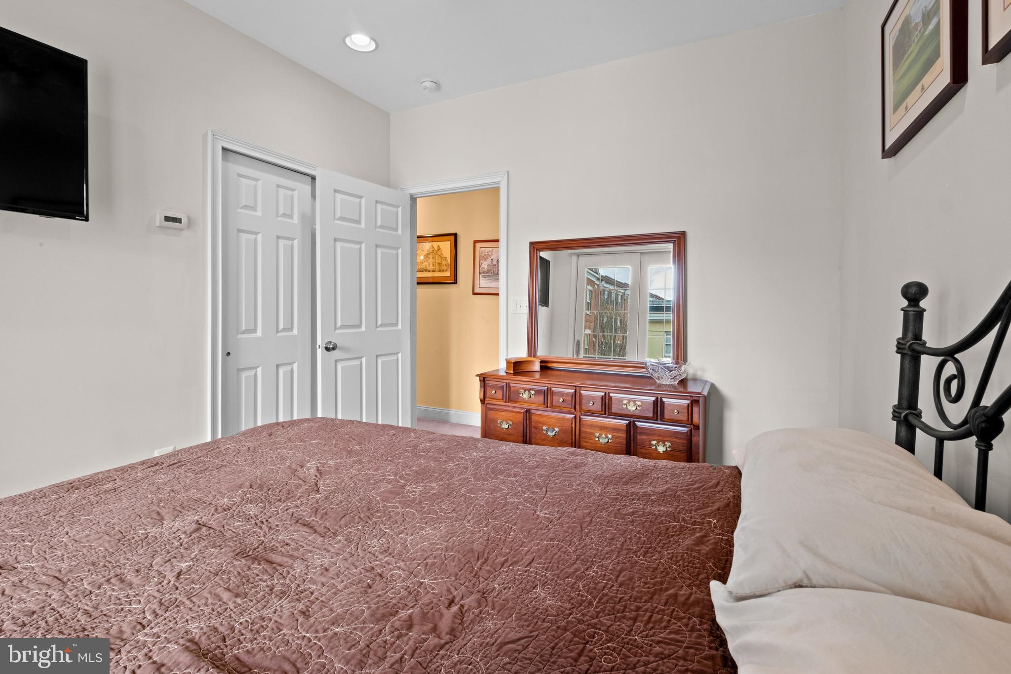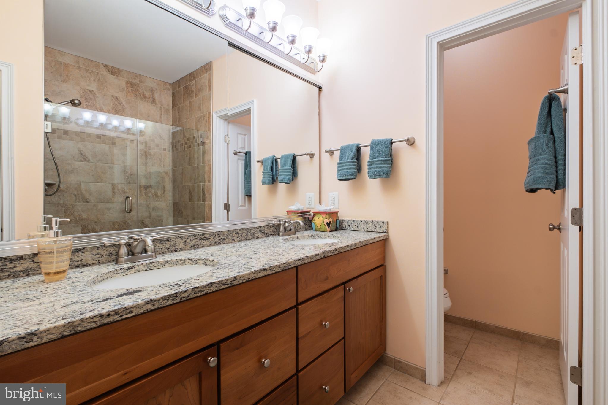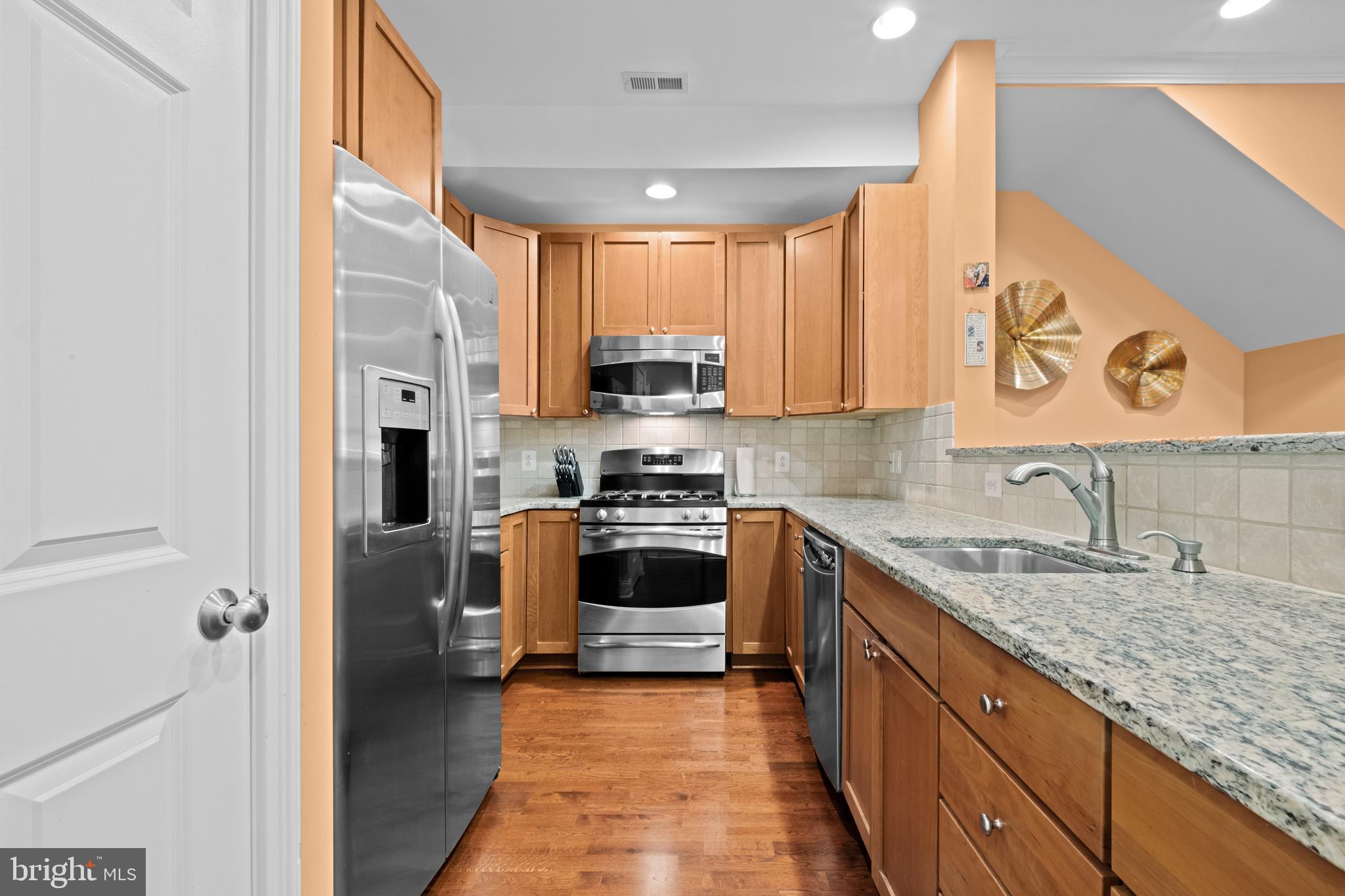 An open-concept living and dining area with beautiful hardwood flooring flows seamlessly into the expansive kitchen, enhanced by generous recessed lighting. The kitchen is appointed with a GE Profile stainless steel appliance package, natural cherry shaker-style cabinetry, granite countertops, a tumbled marble tile backsplash, and a large pantry. A discreet half bath, coat closet, and one-car garage with abundant storage (including shelving & bike racks) complete this level. An additional bonus storage area has been thoughtfully created beneath the stairs.