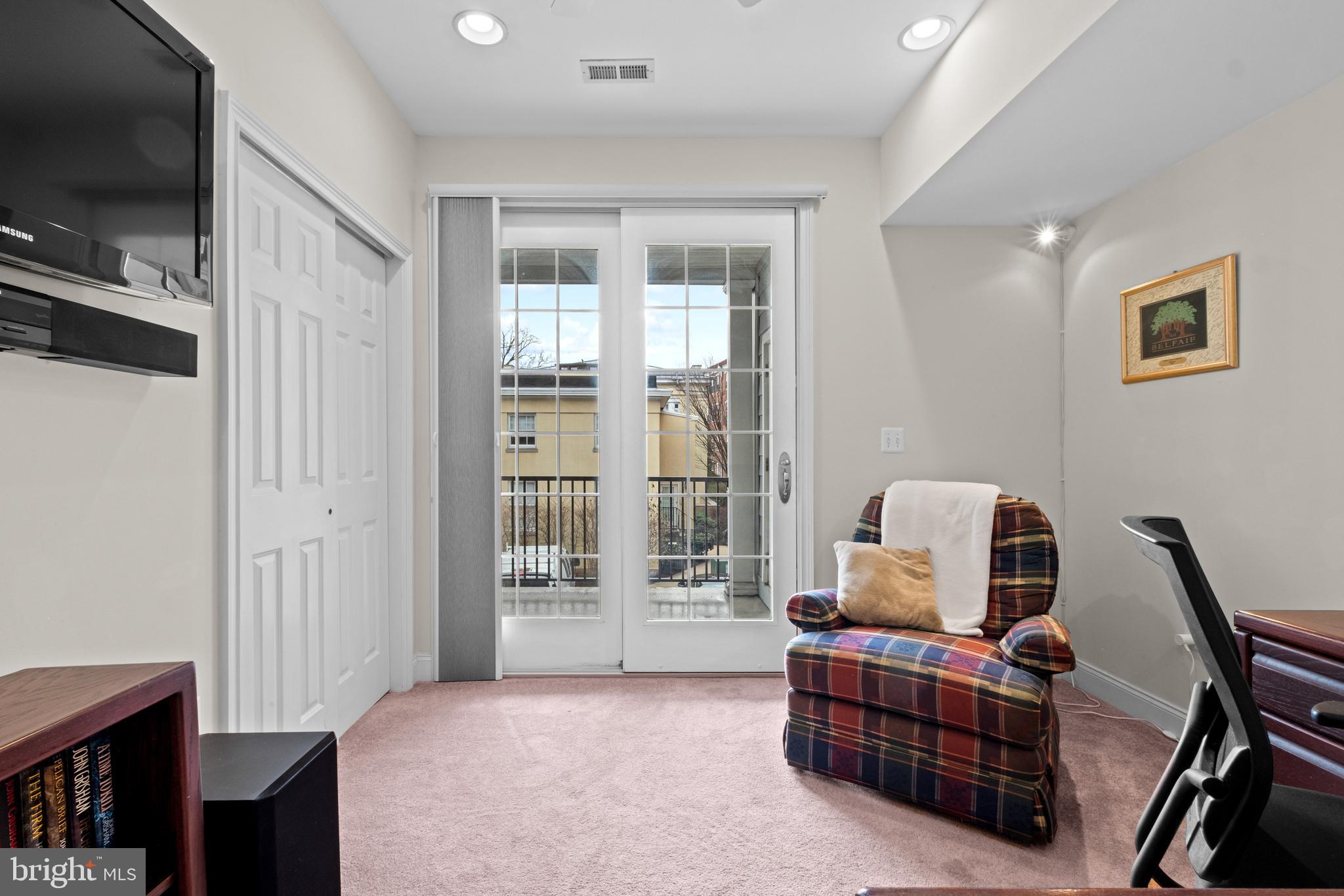 The spacious owner's retreat offers an oversized walk-in closet and a luxurious primary bath. The ensuite is beautifully appointed with an upgraded walk-in shower, dual vanities, a private water closet, and two linen closets. Two additional sun-filled bedrooms feature 8-foot sliding doors that open to a large covered terrace, creating a seamless indoor-outdoor feel. A convenient laundry area with newer Samsung washer & dryer (2021), along with a shared hall bath featuring its own upgraded walk-in shower, completes this level.