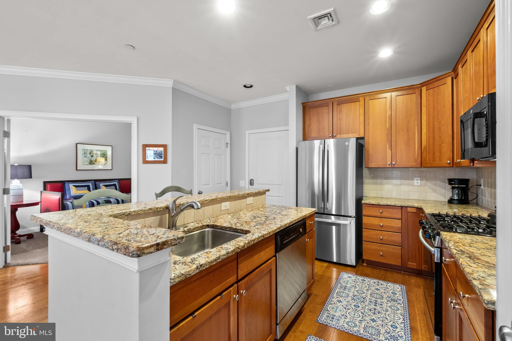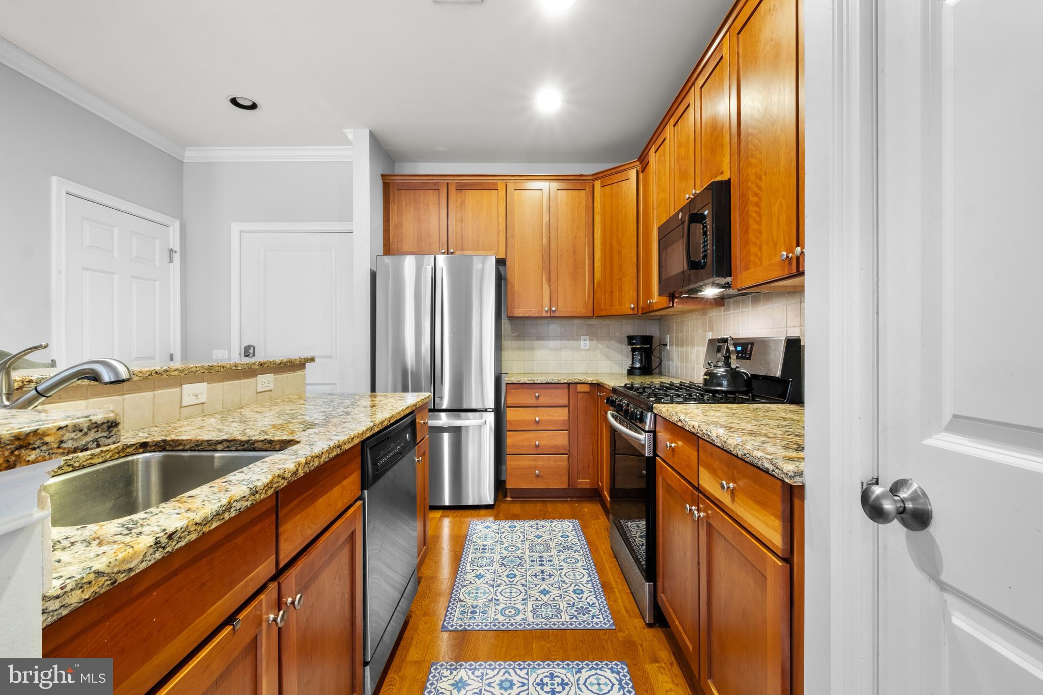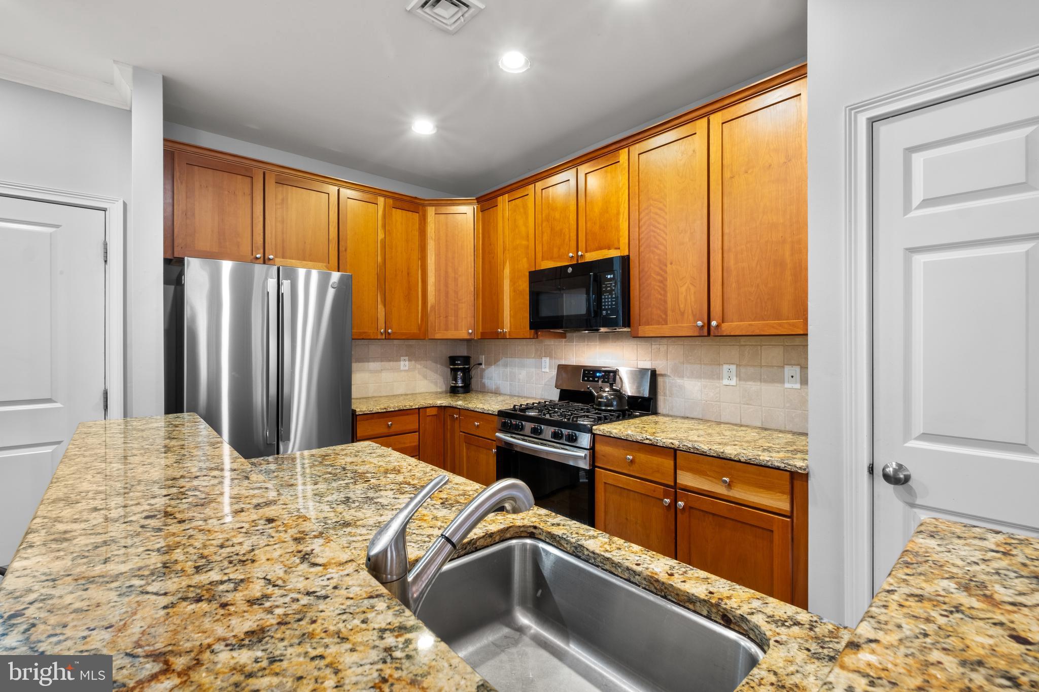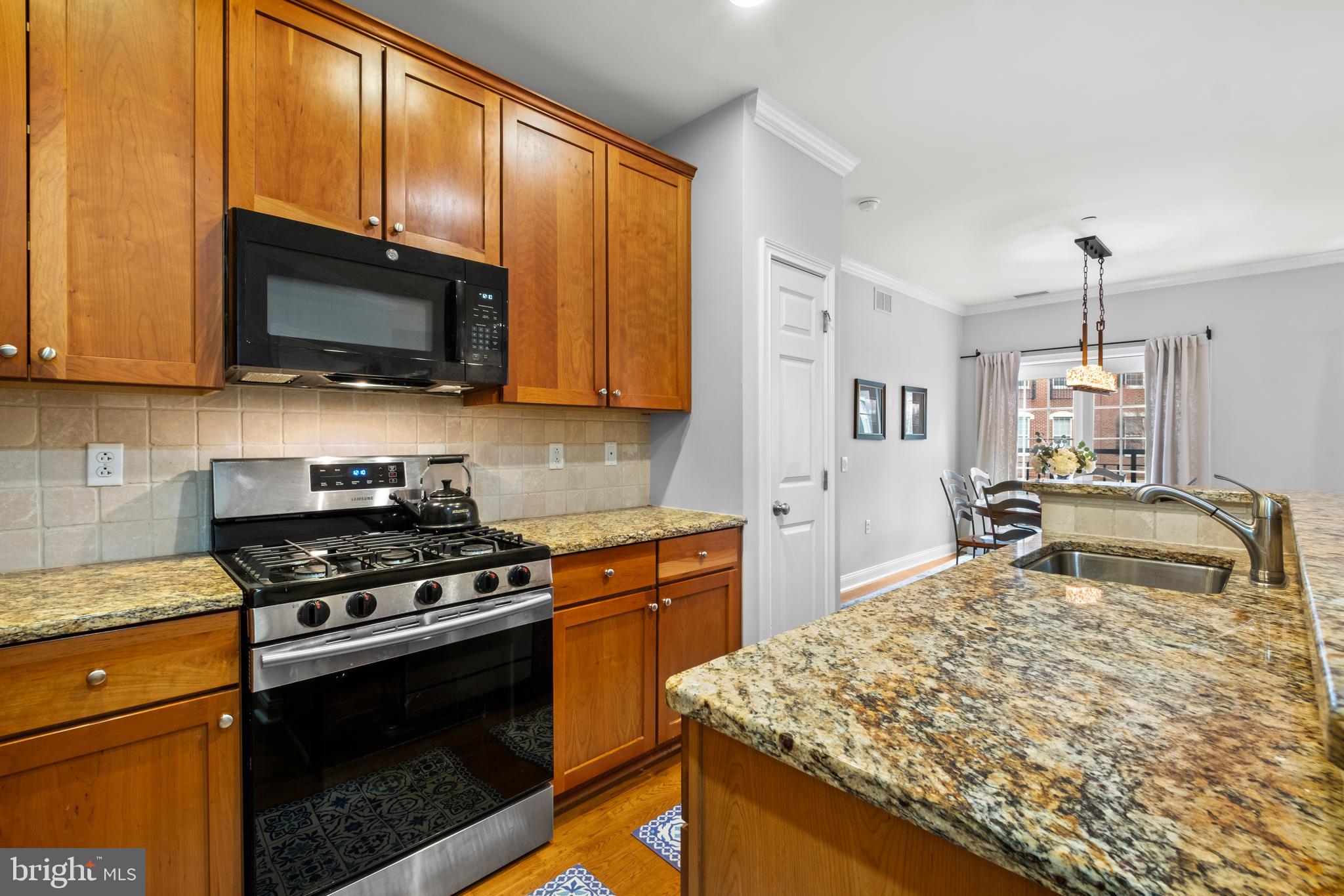 The thoughtfully designed kitchen is a chef's dream, boasting sleek granite countertops, natural cherry cabinets, and stainless steel appliances, including a brand new GE French Door refrigerator & Samsung microwave. Enjoy ample cabinet storage, along with a spacious pantry.
