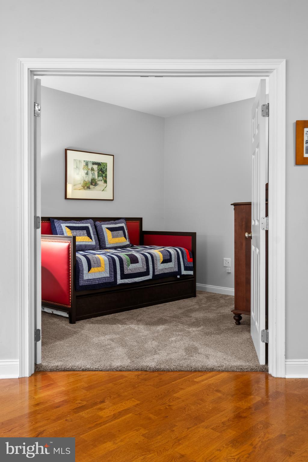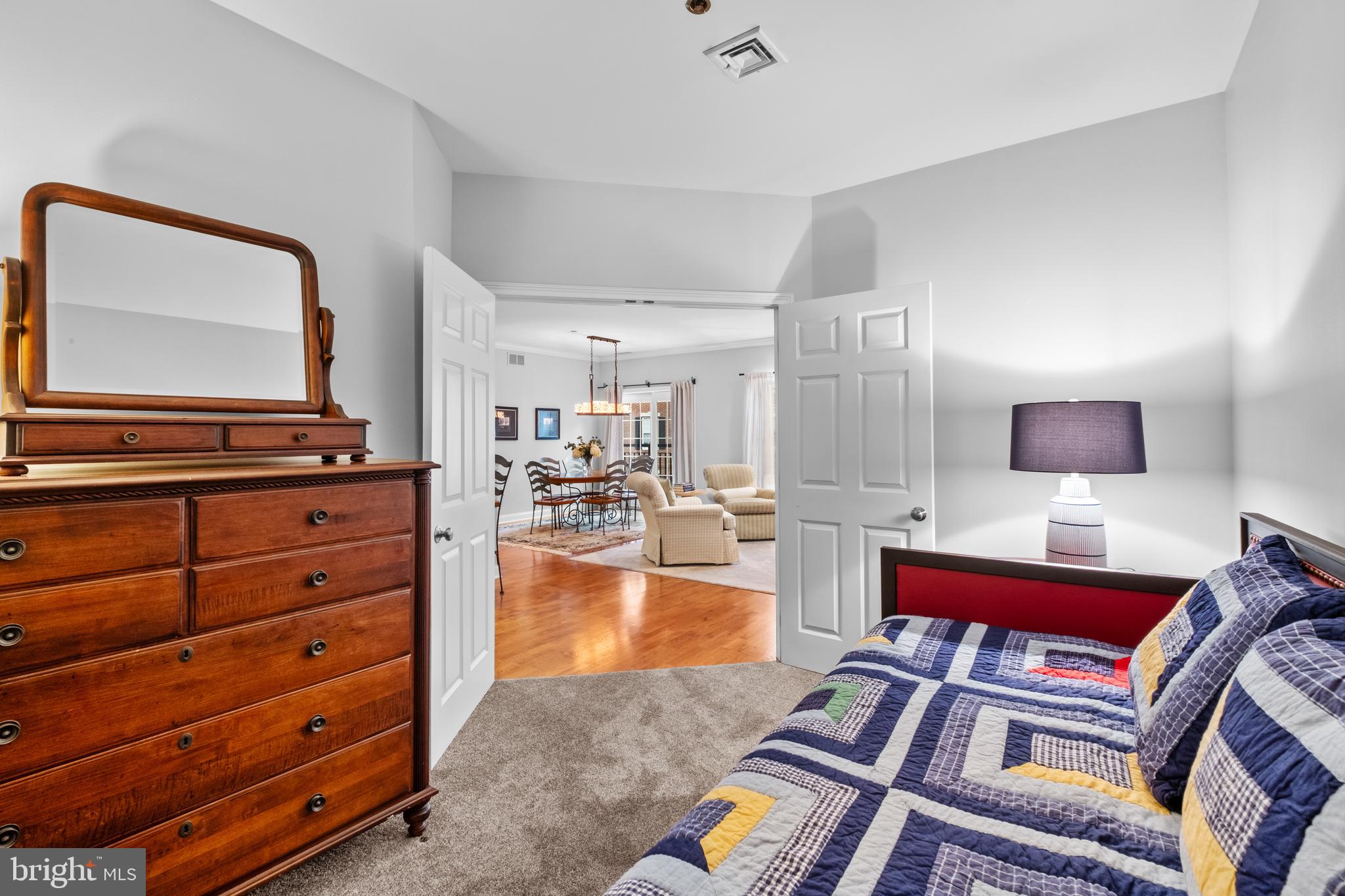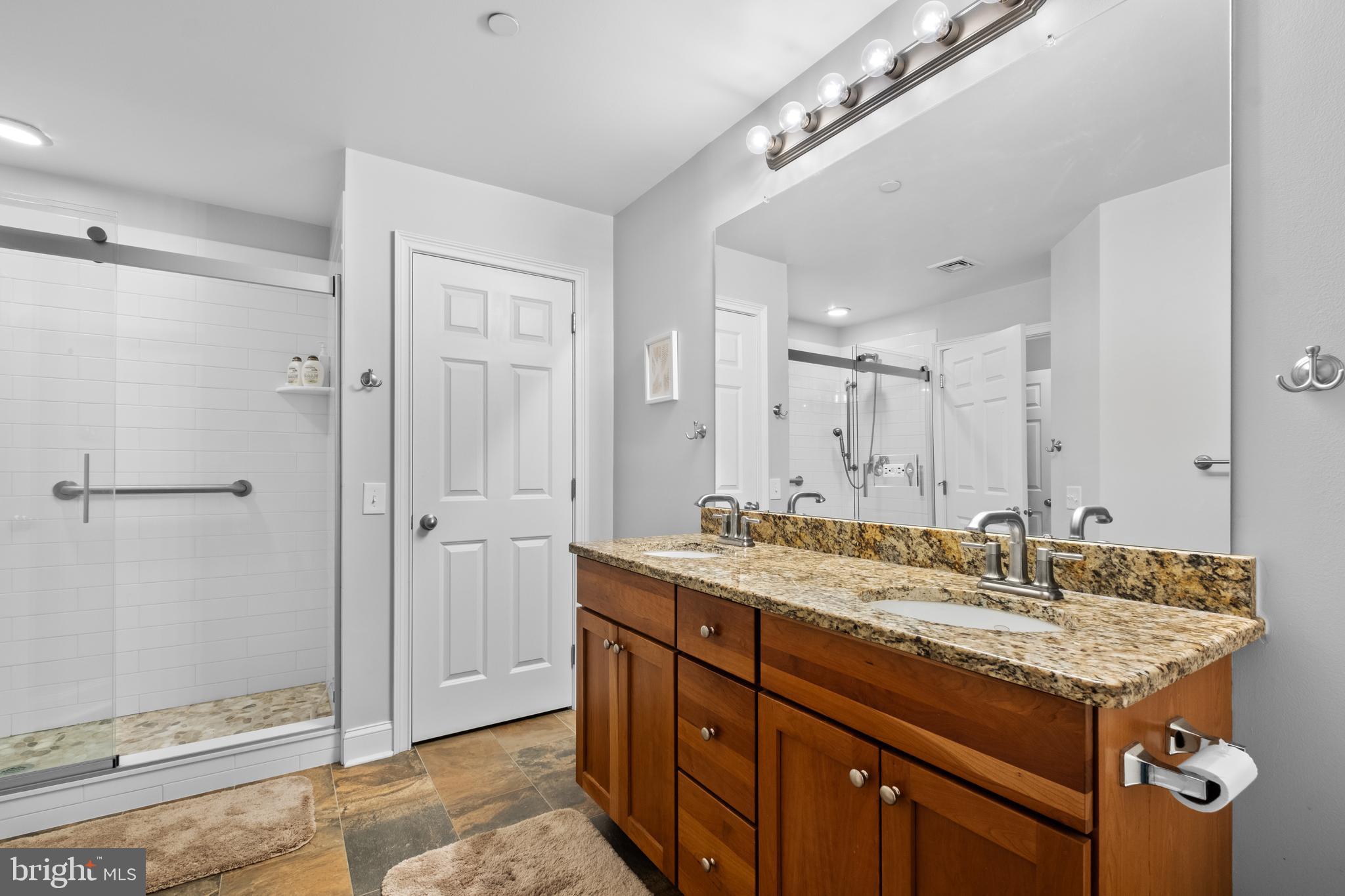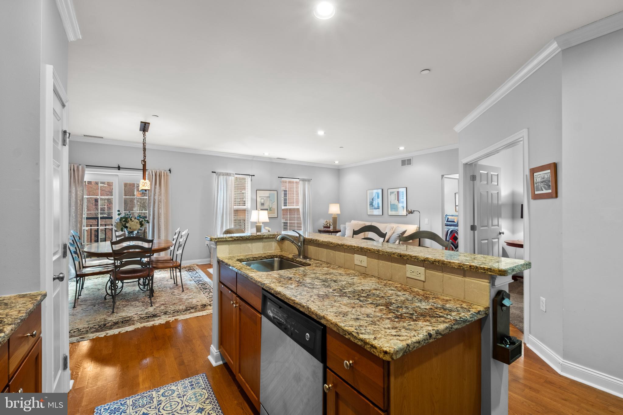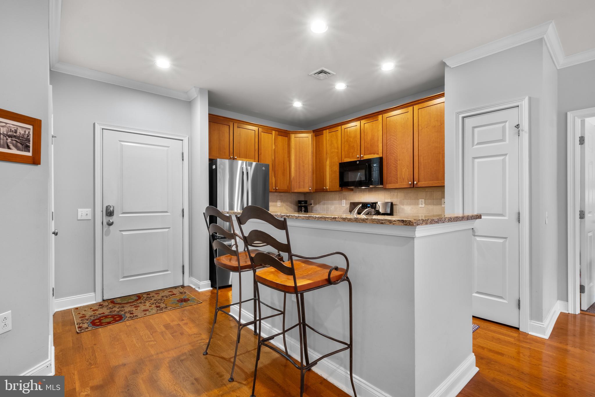 The thoughtfully designed kitchen is a chef's dream, boasting sleek granite countertops, natural cherry cabinets, and stainless steel appliances, including a brand new GE French Door refrigerator & Samsung microwave. Enjoy ample cabinet storage, along with a spacious pantry.