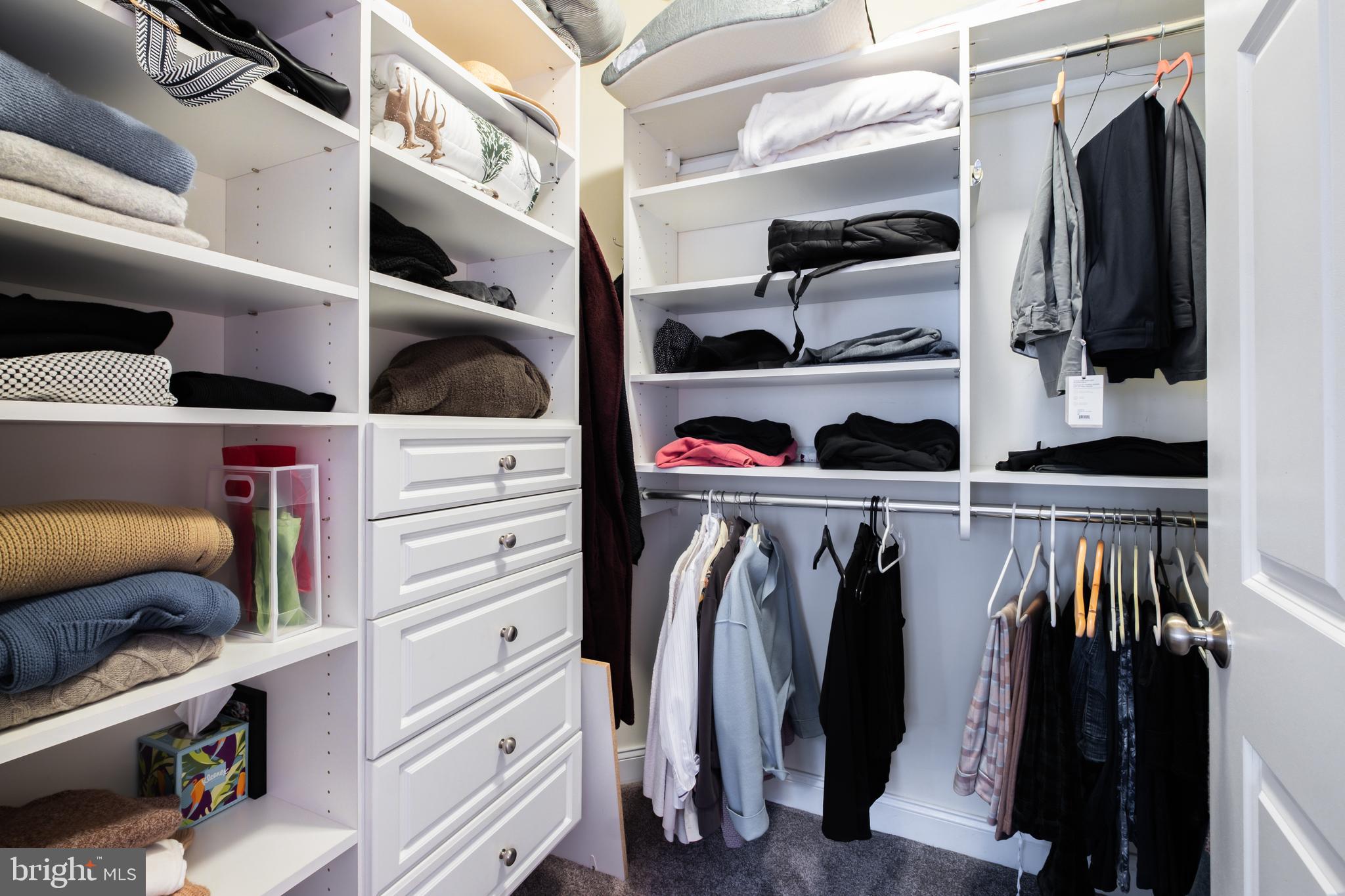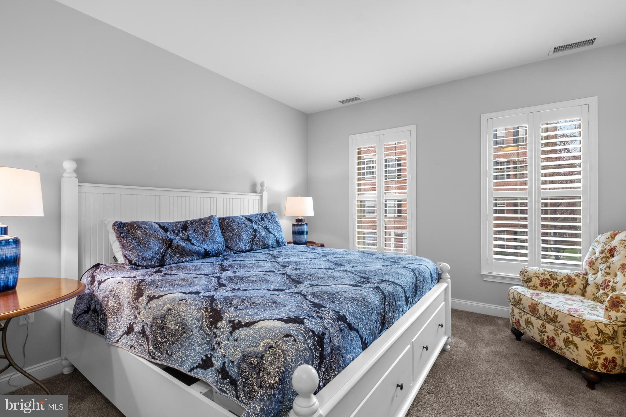 Escape to the serene primary suite, featuring a spacious walk-in closet completely outfitted with custom built-ins, plush carpeting (2024) and gorgeous plantation shutters. The owner's bath is beautifully appointed with granite countertops, dual vanities, and recently renovated to add spacious walk-in shower and additional linen closet.