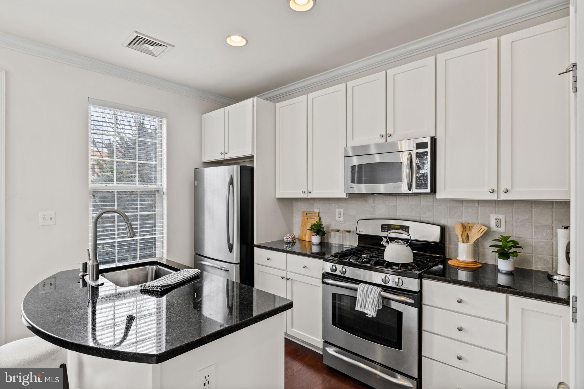 The second level is the heart of the home, featuring an open-concept living/dining space and beautiful hardwood floors and soaring 9 ft.ceilings. The spectacular kitchen, with island, features GE Profile stainless steel appliances, painted shaker-style cabinets, granite counters, and a tumbled marble backsplash. A sliding door in the kitchen opens to a serene maintenance-free Trex deck (2020), perfect for relaxing and enjoying your morning coffee. A discreet powder room is also located on this level.